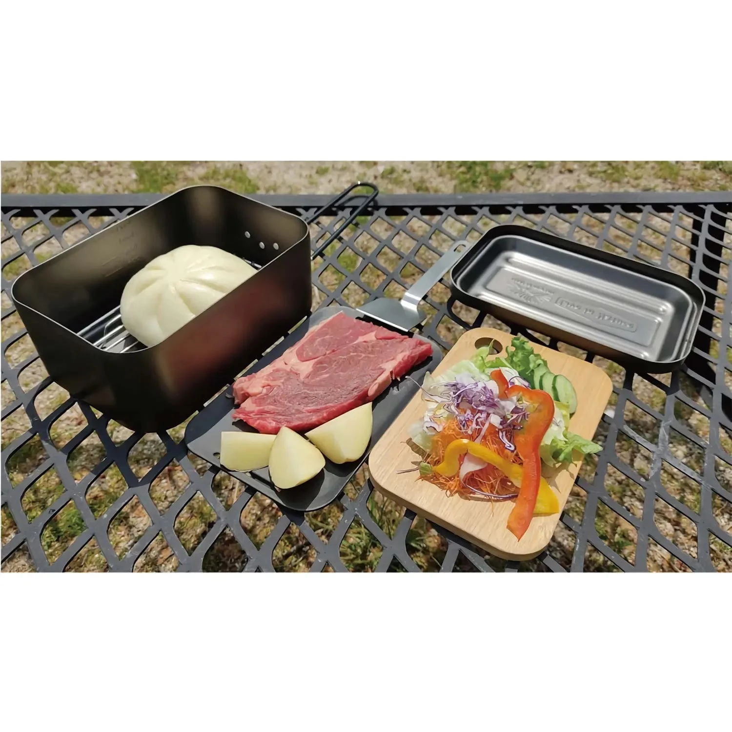- Set includes:Box, lid, cutting board, spatula, metal plate, grill mesh